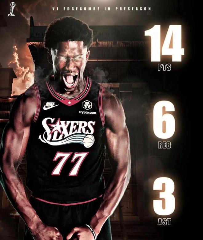 25屆探花秀VJ-埃奇庫姆(費城)在此役,迎來了自己NBA季前賽首秀,以首發(fā)分衛(wèi)身份出戰(zhàn),亮相時間為全場最高的約31分鐘,投籃13中4,其中6中1,罰球5中5貢獻14分6板3助,正負值+1,身體天賦的確瘋狂,可投籃還是有很大的提升空間。